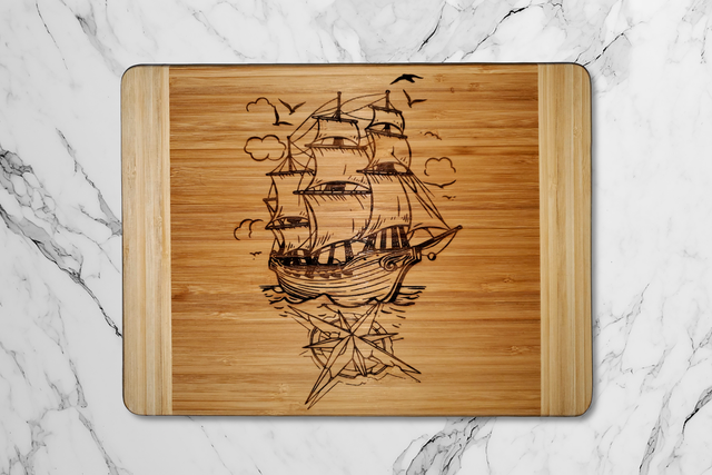 Mesurant 24x32 cm, elle est gravée d'un magnifique motif de navire et de boussole, apportant une ambiance nautique à votre espace culinaire. Parfaite pour la découpe et la présentation, cette planche est à la fois fonctionnelle et décorative, idéale pour les amateurs de cuisine et de décoration.